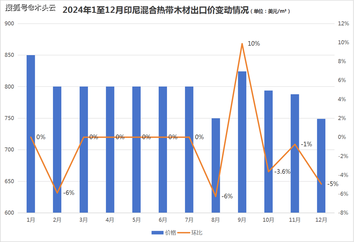 印尼夹杂热带木材方面,其余月份表示较为不变,根基维持正在800美元/立方的程度。而正在8月呈现了全年最低程度,环比下降了6%;随后正在9月攀升至824美元/立方米,环比增加10%。10月至12月持续三月下跌,估计2025岁首年月价钱会有所上调。