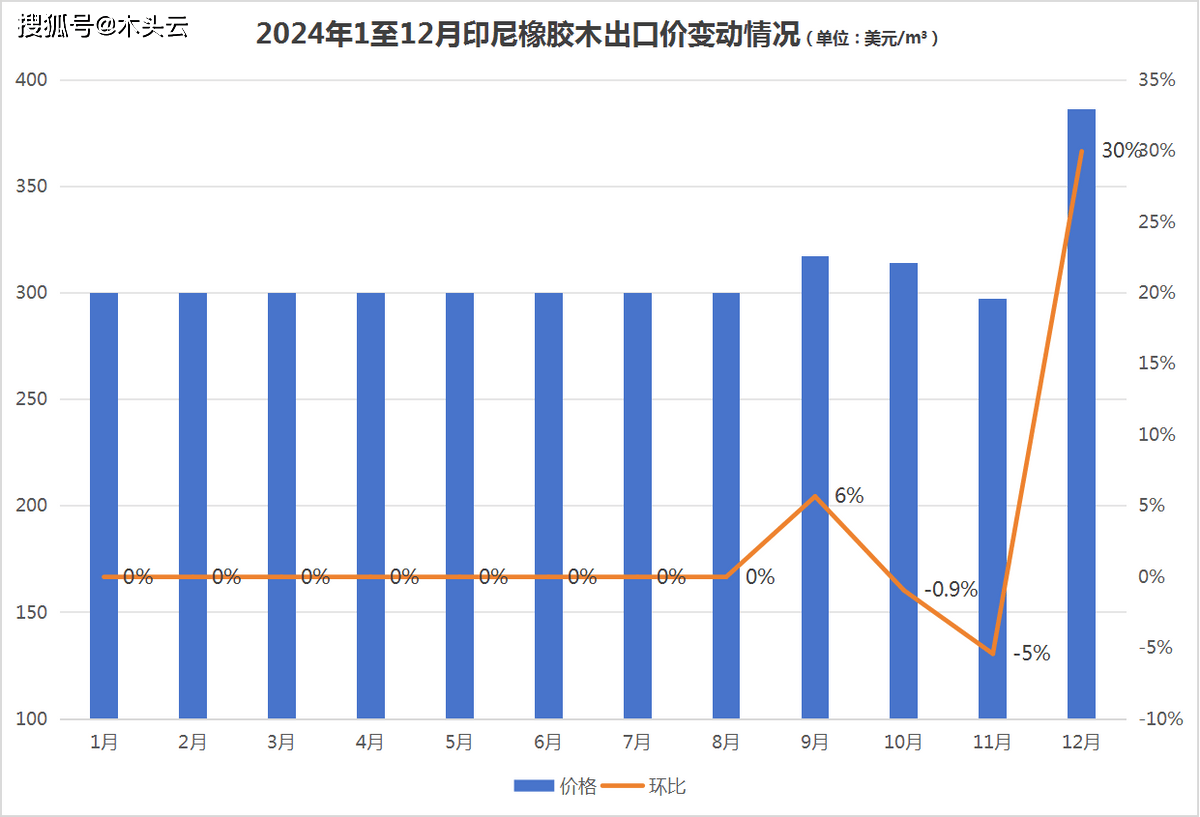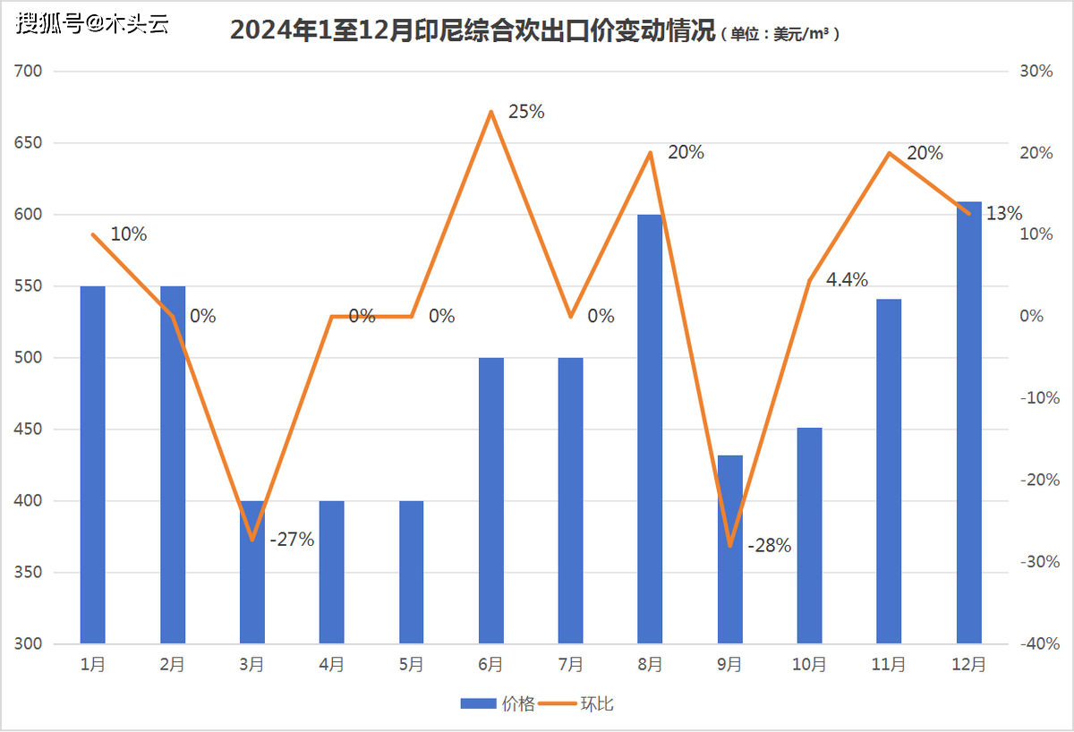 2024年印尼分析欢出口价表示较为波动,环比下井27%至400美元/立方;最高价呈现正在12月,环比增加13%至609美元/立方。其余月份,如1月环比2023年12月增加了10%;6月以及11月均环比增加20%。