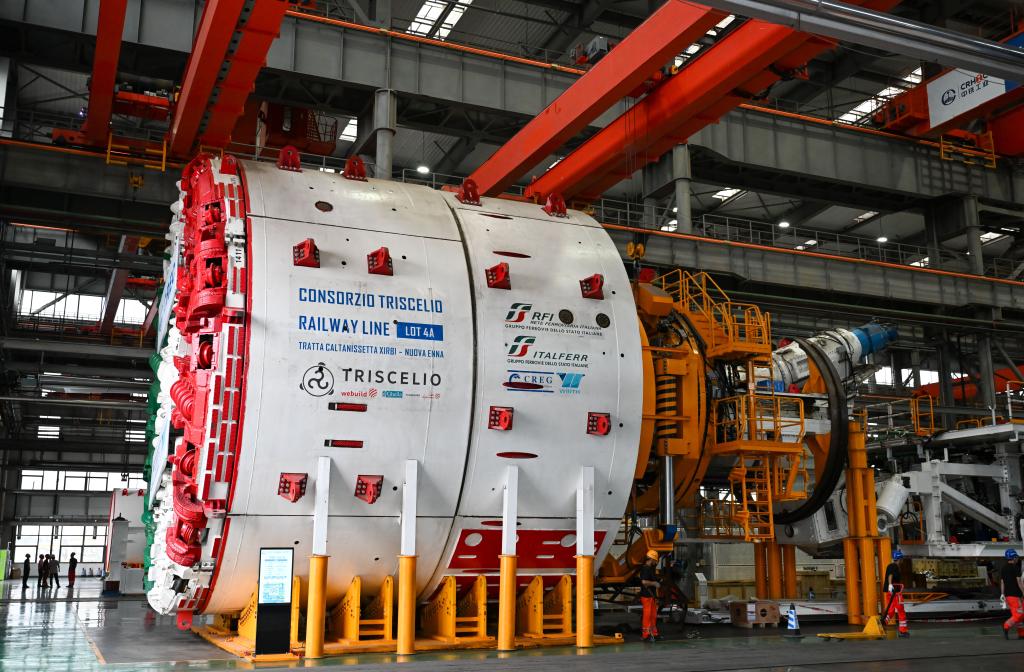 这是6月18日正在天津商业试验区天津港东疆片区的中铁工程配备集团(天津)无限公司拍摄的即将出口意大利的盾构机。记者 孙凡越 摄