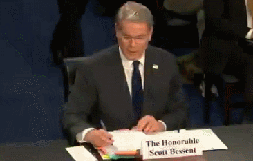人一尴尬,总爱佯拆忙碌,贝森特也不破例。慌乱间,他天性地想交握手指以掩饰严重,却被手中的笔障碍,无法只能腾出另一只手,盘弄话筒,试图缓解尴尬。